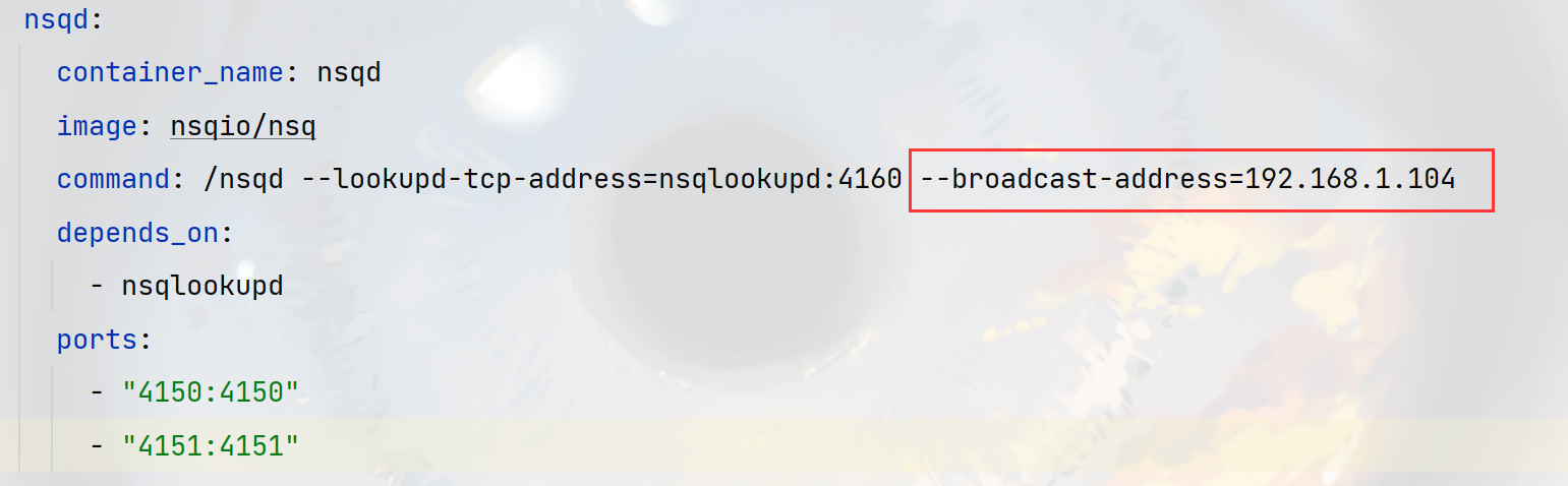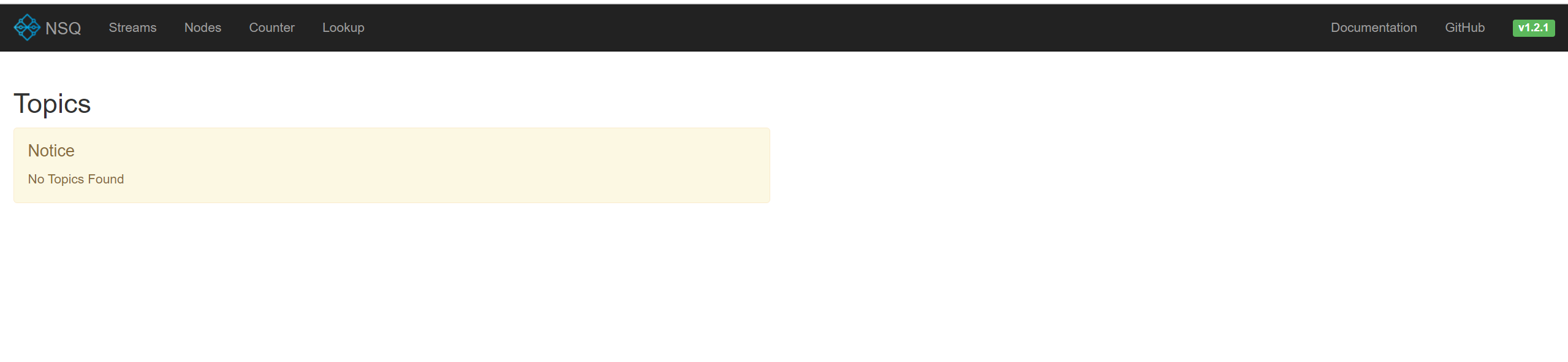 docker-compose.yml:version: '3' services: nsqlookupd: container_name: nsqlookupd image: nsqio/nsq command: /nsqlookupd ports: - "4160:4160" - "4161:4161" nsqd: container_name: nsqd image: nsqio/nsq command: /nsqd --lookupd-tcp-address=nsqlookupd:4160 depends_on: - nsqlookupd ports: - "4150:4150" - "4151:4151" nsqadmin: container_name: nsqadmin image: nsqio/nsq command: /nsqadmin --lookupd-http-address=nsqlookupd:4161 depends_on: - nsqlookupd ports: - "4171:4171"直接绑定nsqlookupd的地址,这样就不会出现错误了。