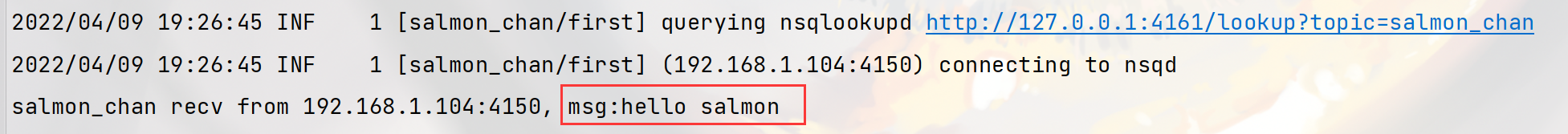 2022/04/09 18:54:30 INF 1 [salmon_chan/first] querying nsqlookupd http://127.0.0.1:4161/lookup?topic=salmon_chan
