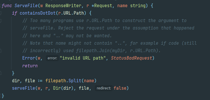 这里比较重要的是fs.Open和f.Stat,第一个,是通过Dir类型实现的FileSystem接口抽象出来的方法。第二个,他并不会真的打开文件,而是获取文件的一些信息,接下来就是针对于这些信息进行校验,确保正确与健壮性。
