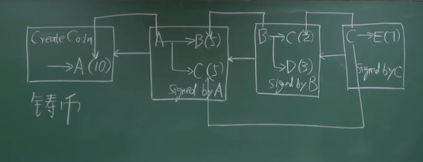 现在,A分别给B和C各五个比特币:A(10) → B(5)C(5)。 该交易需要有A的签名(A用私钥签名,大家可以用A的公钥验证)。同时还要说明花掉的10个比特币从哪来的(第二个方框中的钱是从第一个框内铸币交易中来的),所以交易要包含指向币的来源的哈希指针。