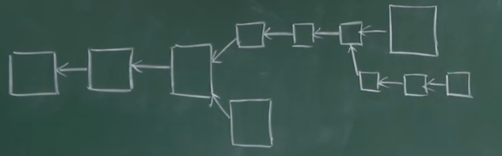 假设大部分节点把区块大小由1M改为0.5M。旧节点依然以1M为准,这时候会出现什么情况?假如一个区块链开始分叉,新节点挖出小区块,这种区块旧节点也是认的。而旧节点挖出的大区块新节点是不认的,旧节点们挖的区块可能就白挖了。这样下去,旧节点看到上面链更长,而且是合法的之后,就会转去挖上面链。旧节点转向上面链挖的话,问题可能又会出现:它们可能又挖出了大区块。而新节点不认这个,新节点会继续沿着大区块前面一个小区块挖,如下图所示。