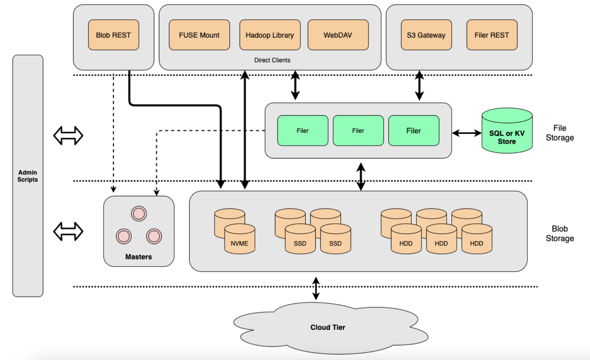 - Blob Storage 由主服务器、卷服务器和云层组成。
