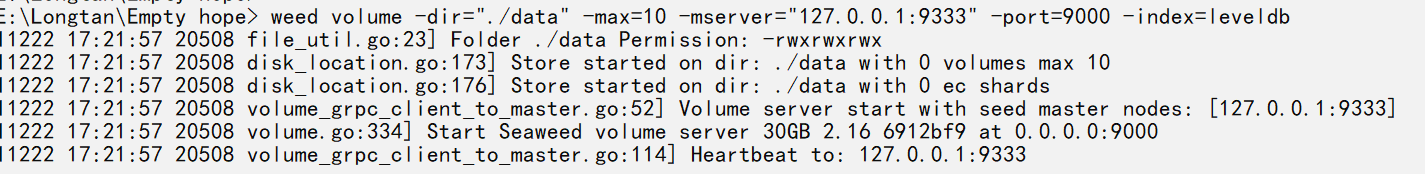 weed volume -dir="./data" -max=10 -mserver="127.0.0.1:9333" -port=9000 -index=leveldb