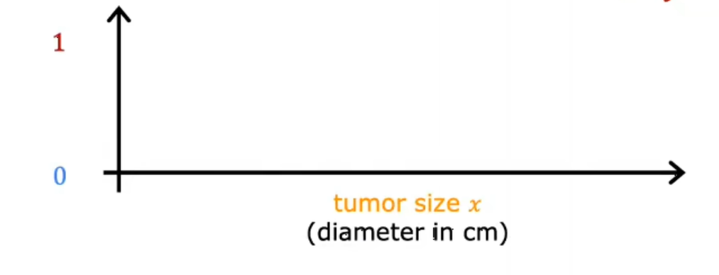x轴代表肿瘤的大小,y轴只代表两个值,0还是1,取决于肿瘤是良性还是恶性,这与回归不同的一个原因是,我们只试图预测一小部分可能的输出或类别。