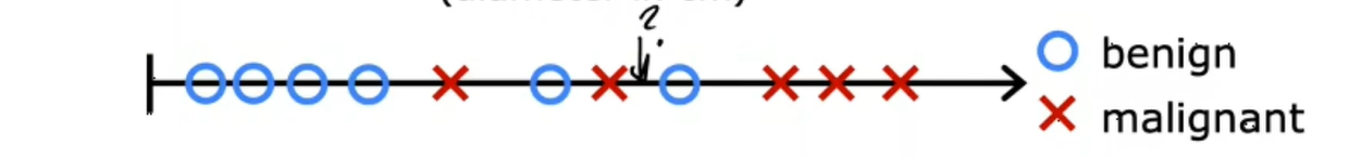 所以数据集里有各种大小的肿瘤,这些肿瘤是良性,标记为0,或者是恶性的,标记为1,然后你可以把你的数据绘制在这样的图表上: