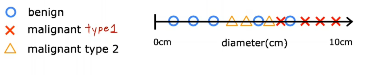 可以用圈和叉来表示良性和恶性。如果正好处于叉和圈的中间,这时,你的系统会把这个肿瘤分为良性还是恶性?这是需要解决的问题。