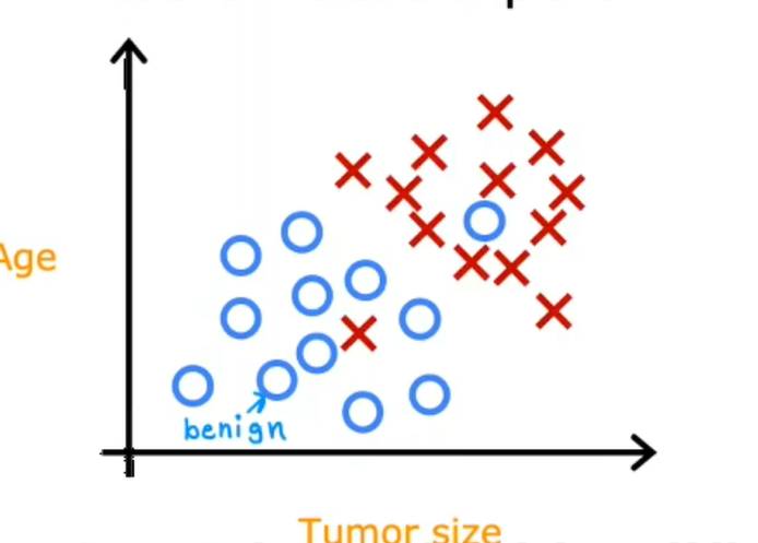 比如上方的例子,除了输入是肿瘤的大小,假设也有每个病人的年龄,现在新的数据集有两个输入,年龄和肿瘤大小,绘制这个新的数据集就是这样的: