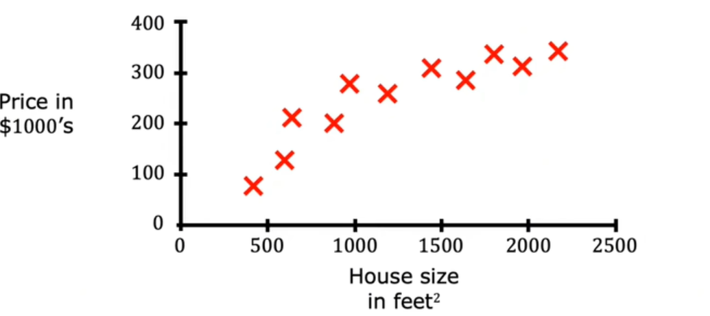 假设现在有一个要预测房价走势价值的程序,这个程序要结合从房子的面积和价格可以得到这样的图: