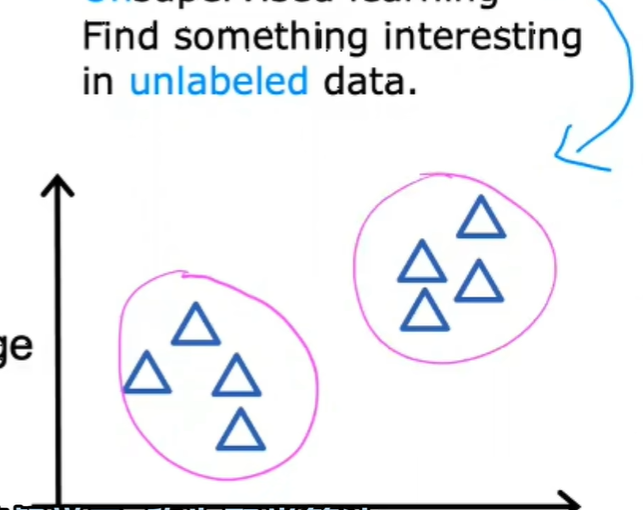 无监督学习算法可能会决定将数据分配给两个不同的组或两个不同的集群。所以它可能决定这里有一个数据组或者是另一个地方有一个另外的数据组,这是一种特殊类型的无监督学习,称为聚类算法。