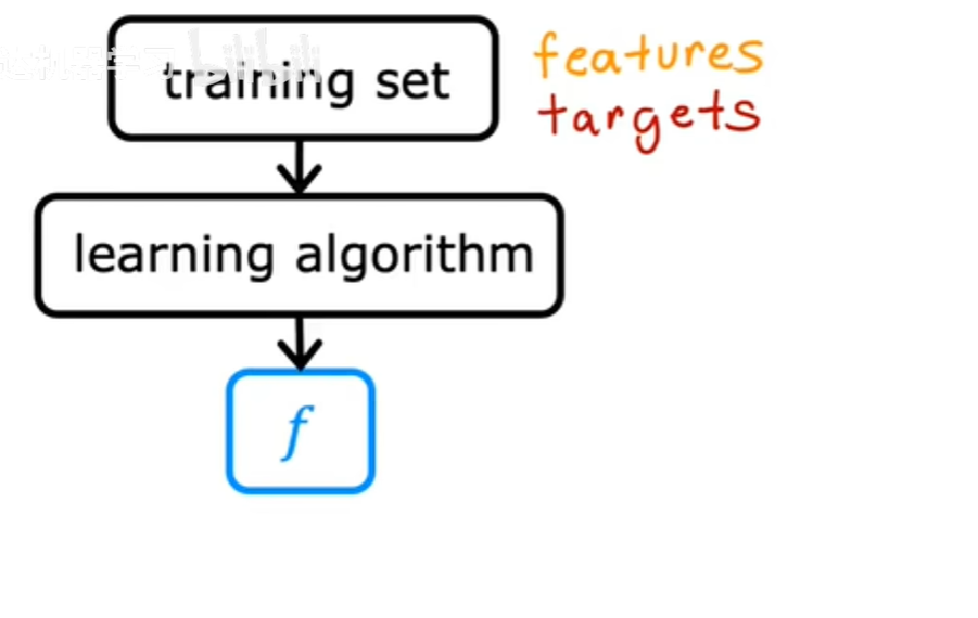 监督学习中的训练集包括输入特征(例如房屋大小)和输出目标(房屋价格),输出目标是我们将从中学习的模型的正确答案,要训练模型,需要将训练集(包括输入特征和输出目标)提供给学习算法,然后监督学习算法会产生一些功能。