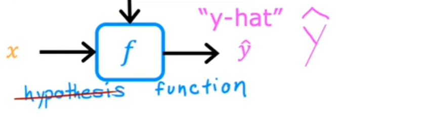 历史上,这个函数曾经被称为假设,但我在这个类中只是将它称为函数f,f的工作是采用新的输入x和输出并进行估计或预测,我将其称为y-hat,它的写法类似于顶部带有这个小帽子符号的变量y: