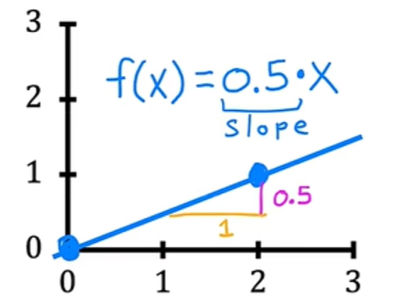 如果w=0.5,b=0,则x的f为x的0.5倍,当x为0时,预测也为0,当x为2时,则预测为2的0.5倍,即1。将得到一条看起来像这样的线,并注意到斜率为0.5除以1,w的值给出了直线的斜率,即0.5: