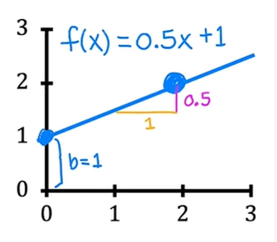 如果w=0.5,b=1则x的f是x+1的0.5倍,当x为0时,x的f等于b,即1,因此直线与垂直轴b相交,即y截距。同样的,当x为2时,x的f为2,因此该行看起来像这样:同样,这个斜率时0.5除以1,所以w的值给你的斜率为0.5: