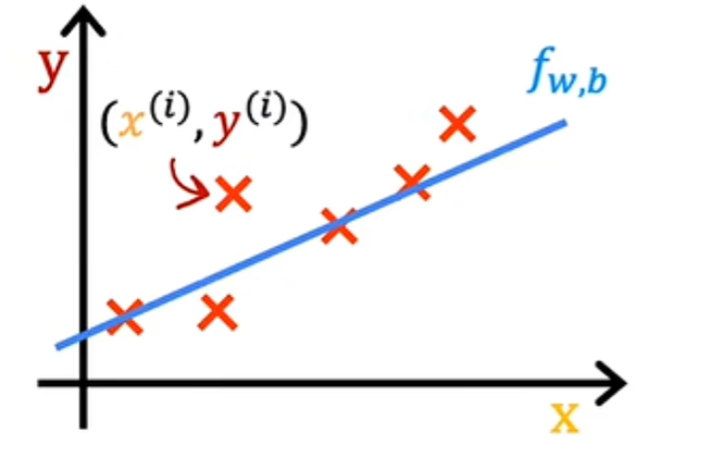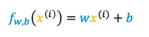 对于我们选择的x^i的模型f是w乘以x^i加上b,换句话说,预测y-hat i 是f of wb of x^i,其中对于我们使用的模型,f of x^i等于wx^i 加b: