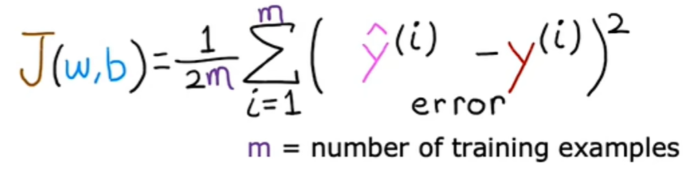 现在的问题是如何找到w和b的值,以便对于许多或可能所有训练示例x^i、y^i的预测y-hat i 接近真实目标y^i。要回答这个问题,我们先来看看如何衡量一条直线与训练数据的拟合程度,为此,我们将构建一个成本函数,成本函数采用预测y-hat并通过取y-hat减去y将其目标y进行比较。ps: (y-hat) - y,这种差异称为误差,我们正在测量预测与目标的距离。