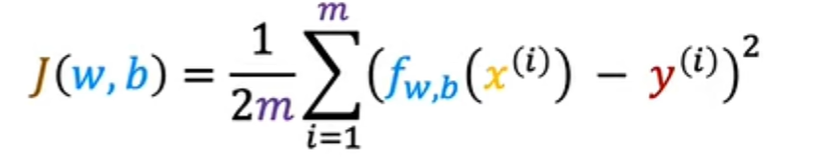 机器学习人使用的成本函数实际上是除以2乘以m,额外除以2只是为了让我们后面的一些计算看起来更整洁,但无论是否包含这个除以2,成本函数都是有效的,此处的表达式是成本函数,我们将写wb的J来指代成本函数: