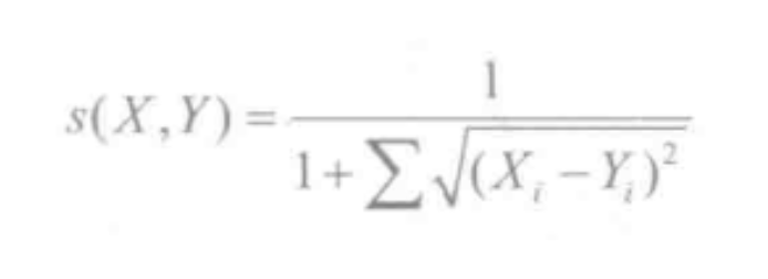 欧式距离计算相似度是所有相似度计算里面最简单、最易理解的方法。它以经过人们一致评价的物品为坐标轴,然后将参与评价的人绘制到坐标系上,并计算他们彼此之间的直线距离。计算出来的欧几里德距离是一个大0的数,为了使其更能体现用户之间的相似度,可以把它规约到(0.1]之间,最终得到如下计算公式: